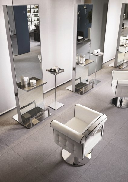 Вариант 1 - Зеркало парикмахерское двухстороннее, крепление к полу. Рабочий туалет оснащен столешницами и металлическими подставками для ног.