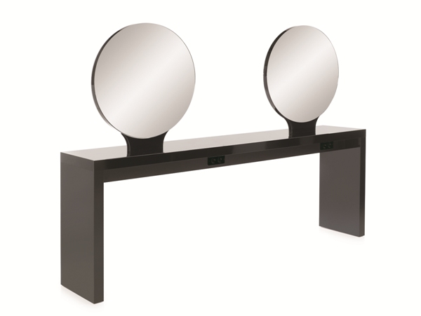 Двусторонний рабочий туалет на четыре рабочих места. Рабочий туалет оснащен зеркалами округлой формы.