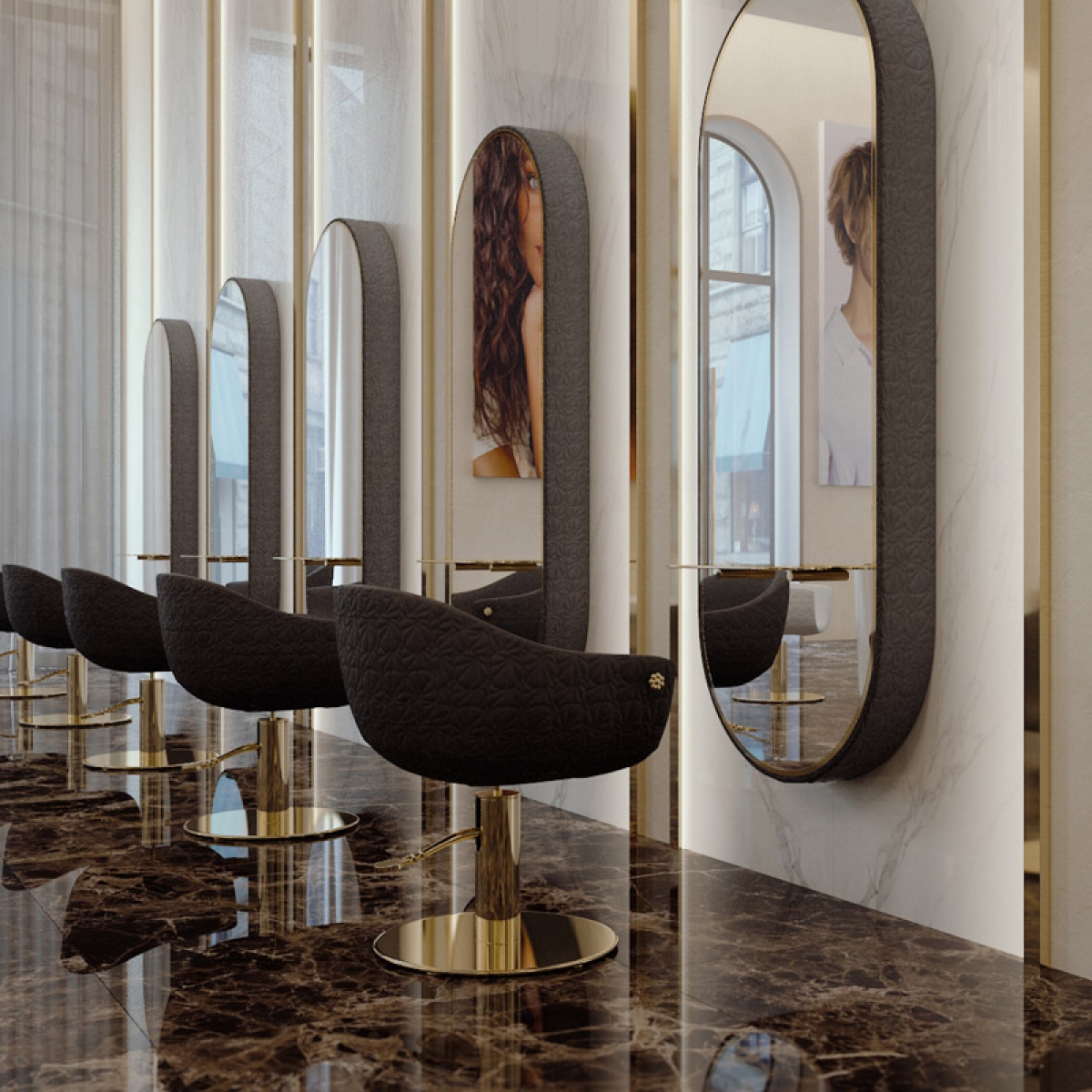 Зеркало парикмахерское с декоративной рамкой. Окантовка (торец) зеркала имеет декоративную отделку из искусственной кожи высшего качества LOTUS SKAI (Белый WHITE, черный BLACK или розовый PINK). Зеркало оснащено столешницей в черном матовом цвете. Крепление к стене.