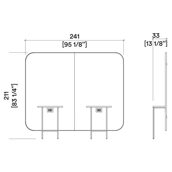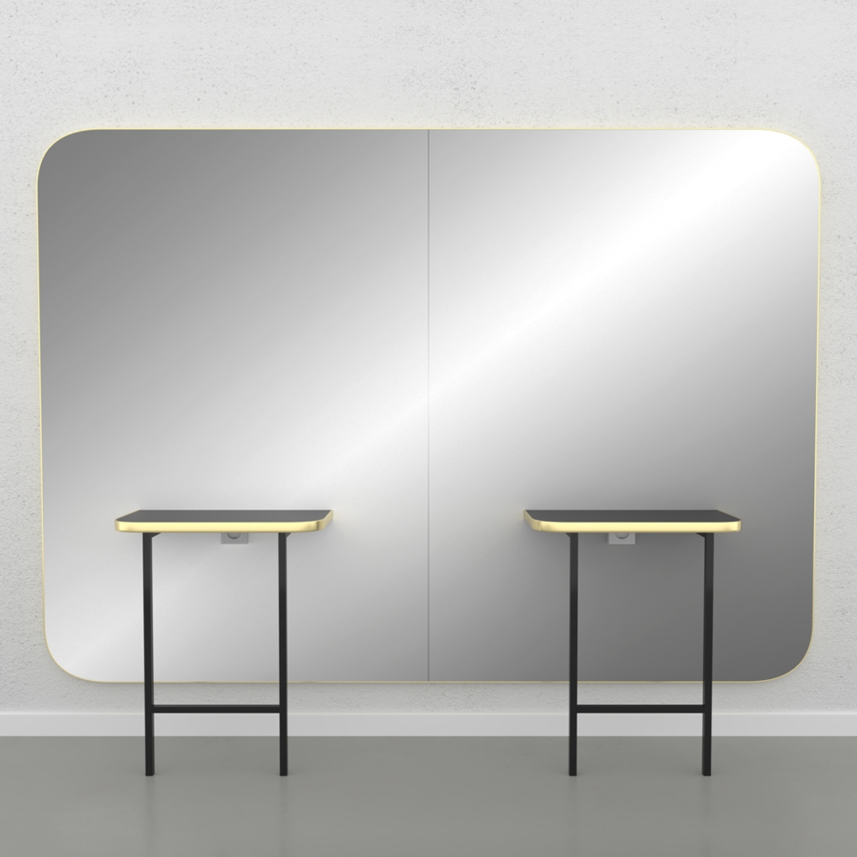 Рабочий туалет на два рабочих места. Рабочий туалет оснащен консолями, выполненными из металла окрашенного в черный цвет, с подставками под ноги. Окантовка столешниц выполнена в глянцевом черном или золотом цвете.