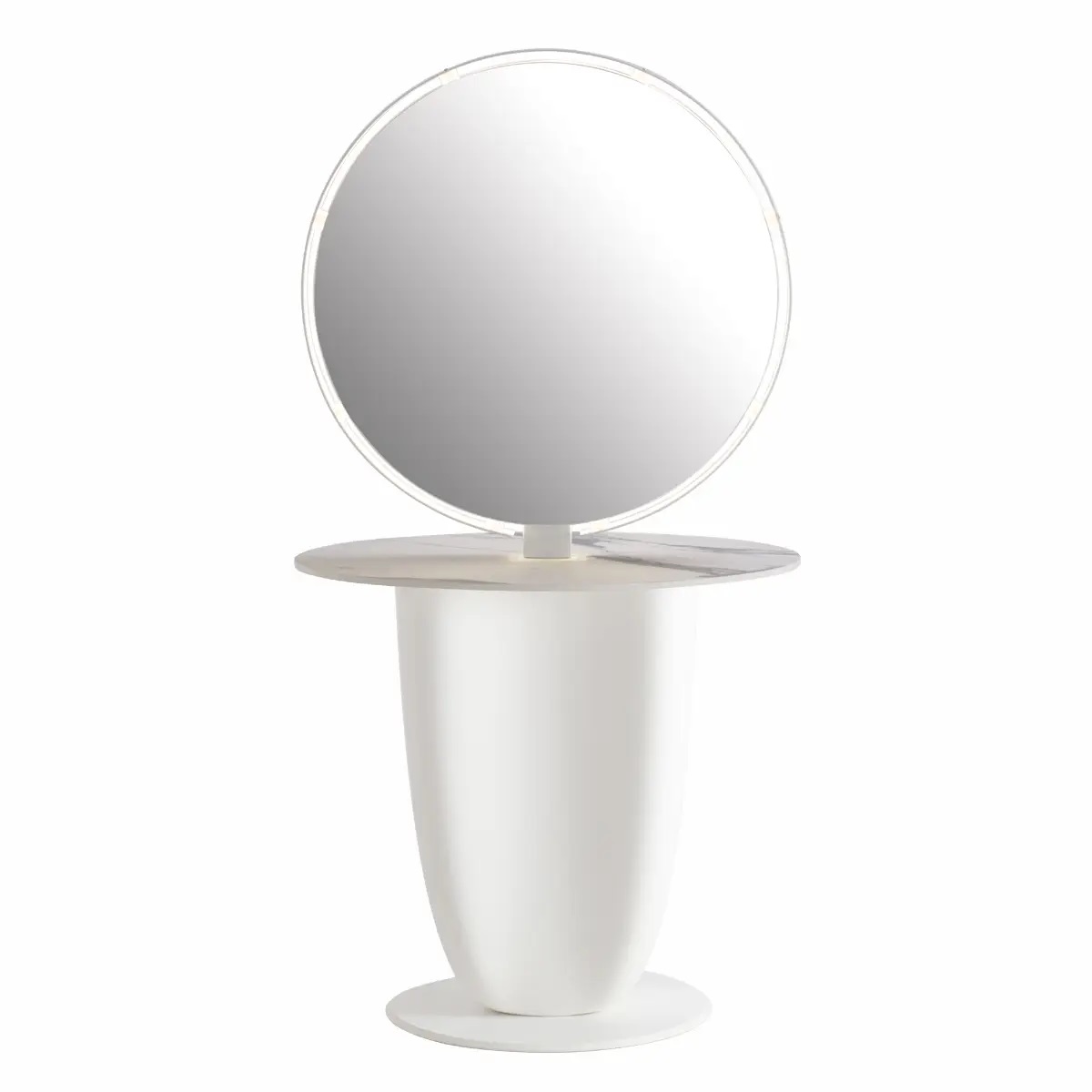 Зеркало парикмахерское двухстороннее. Зеркало оснащено столешницей и округлым основанием. Каркас выполнен из пластика белого цвета. Крепление к полу