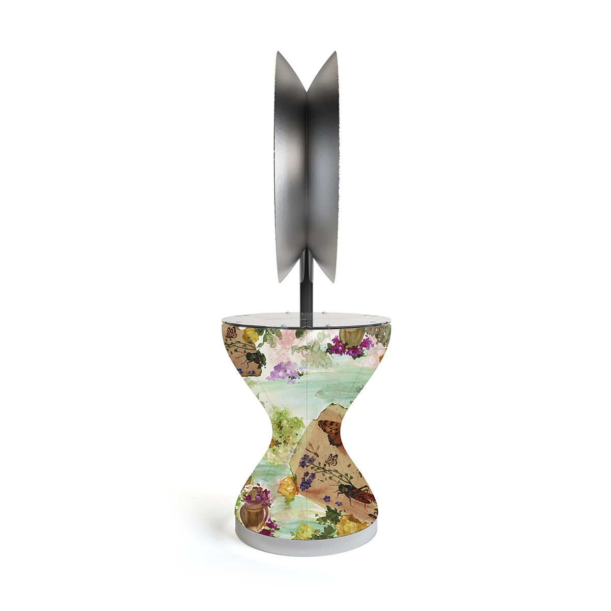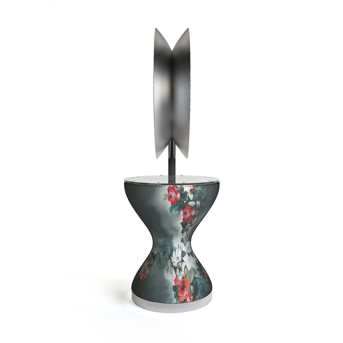 Дизайнерский двусторонний рабочий туалет на два рабочих места со съемным тканевым покрытием. Зеркало рабочего туалета округлой формы выполено в декоративной раме с покрытием "серебрянная фольга". Рабочий туалет оснащен зеркалами со светодиодной подсветкой LED, столешницей из нержавеющей стали с выдвижными фенодержателями и выдвижными секциями благодаря которым открывается доступ к нишам для хранения инструментов в которых расположены электрические розетки и USB-порт.