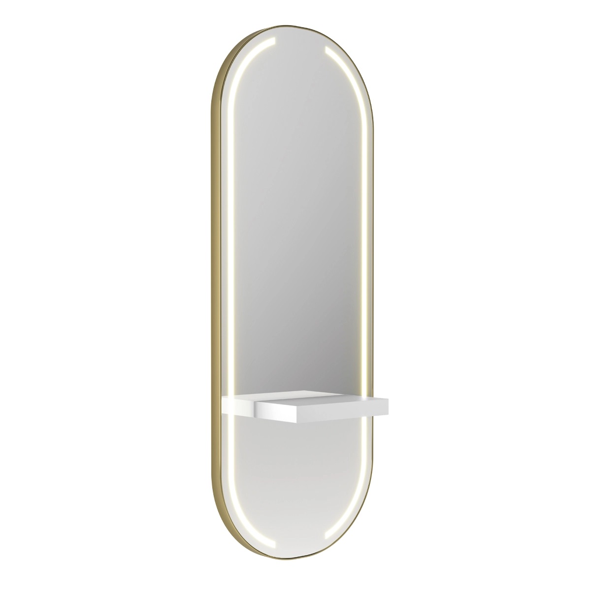 Рабочий туалет овальной формы. Рабочий туалет оснащен столешницей из глянцевого белого или черного акрила. Окантовка рамки выполнена в глянцевом золотом, хромированном или черном цвете. Зеркало оснащено лицевой светодиодной подсветкой. Крепление к стене.