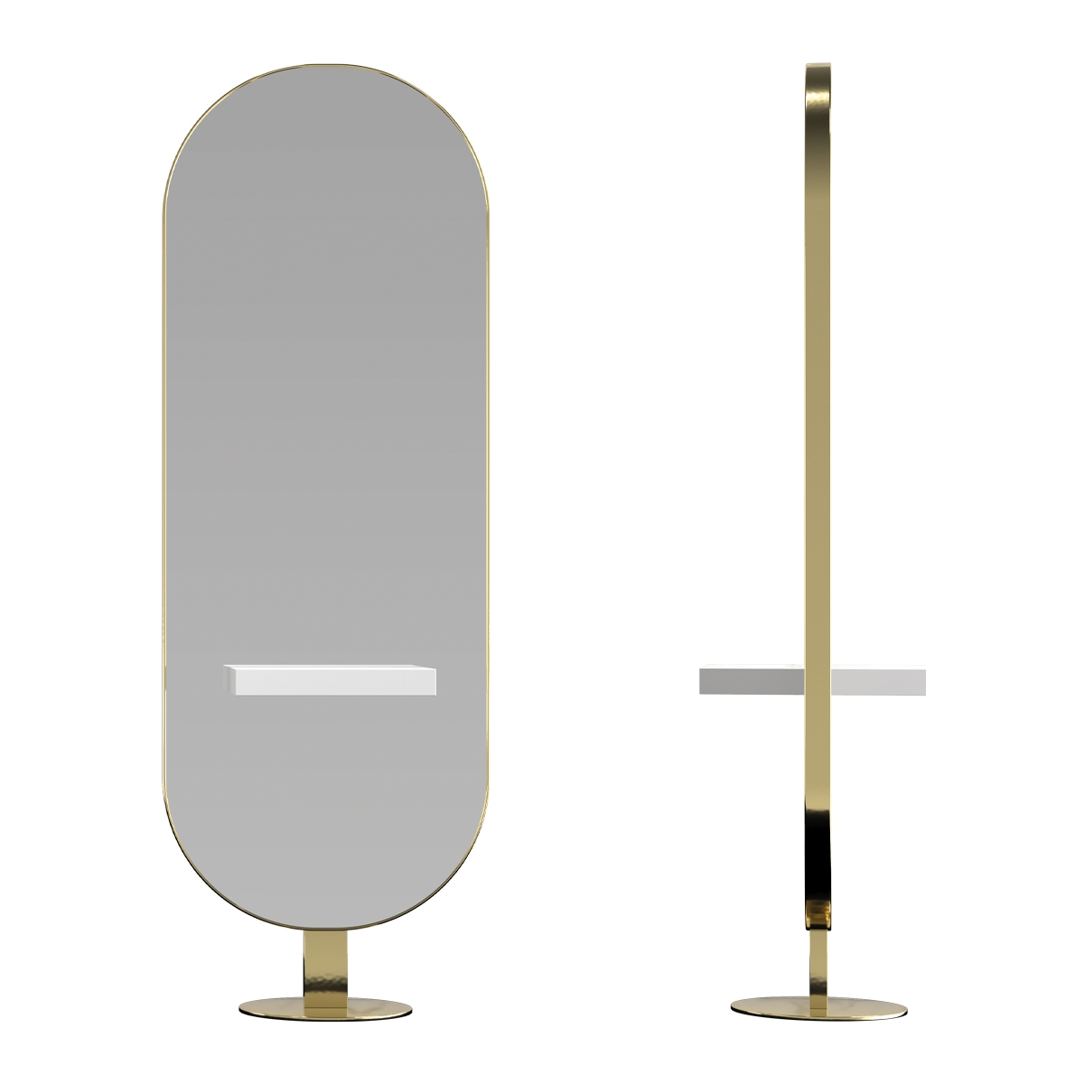 Двусторонний рабочий туалет на два рабочих места. Рабочий туалет оснащен столешницами из глянцевого белого или черного акрила, четырьмя (по две с каждой стороны) розетками под столешницами, а также металлическим основанием округлой формы. Окантовка рамки и основание выполнены в глянцевом золотом, хромированном или черном цвете. Крепление к полу.