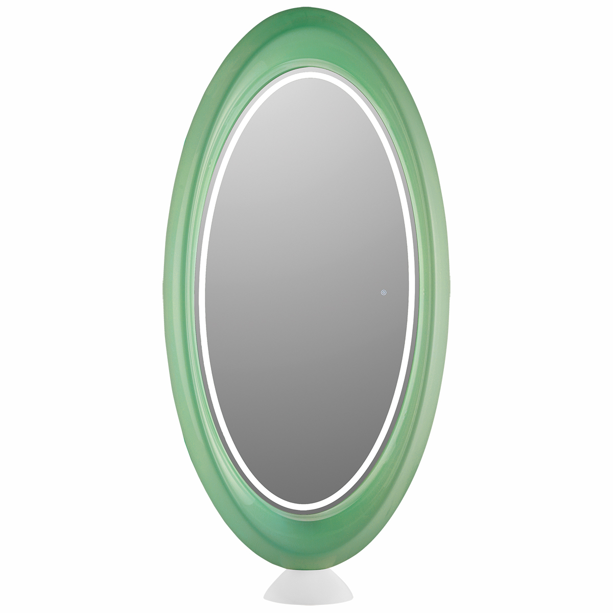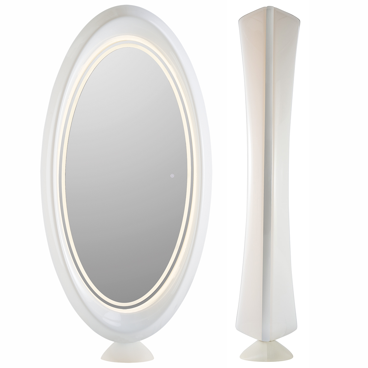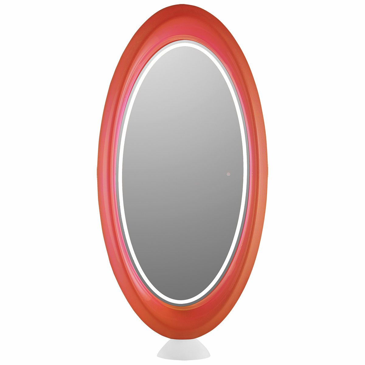 Зеркало парикмахерское двустороннее овальной формы. Зеркало оснащено светодиодной RGB LED подсветкой. Каркас выполнен из глянцевого пластика белого цвета. Крепление к полу.
