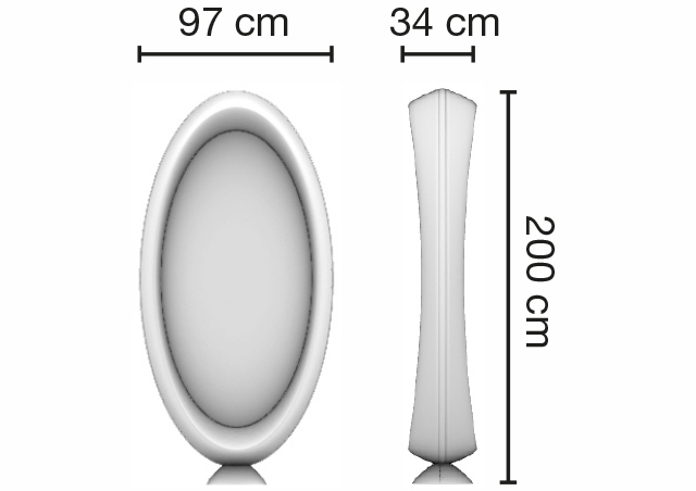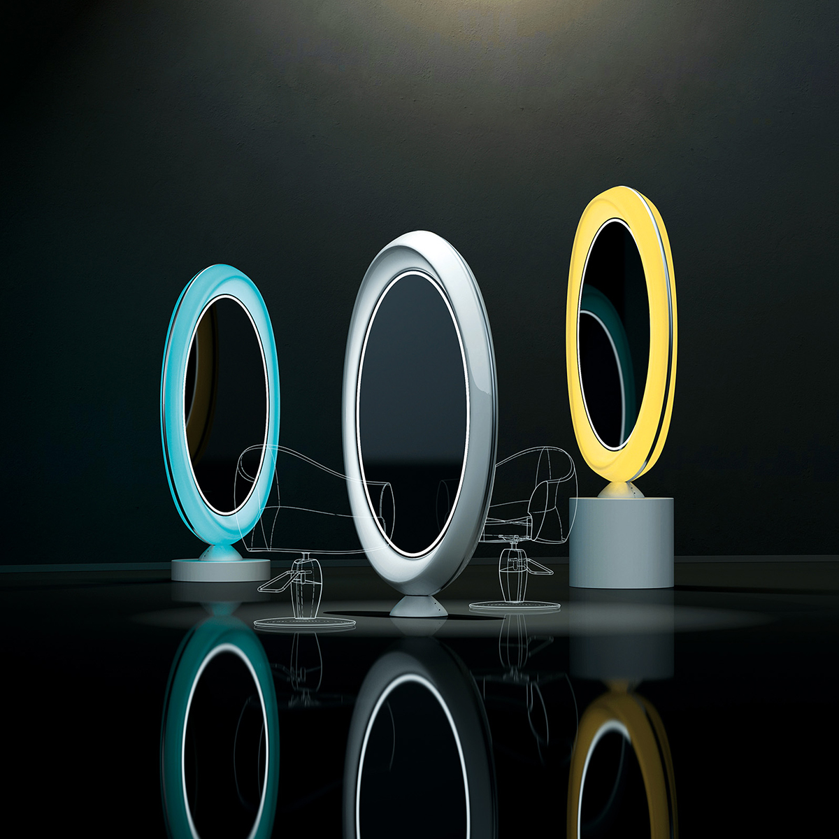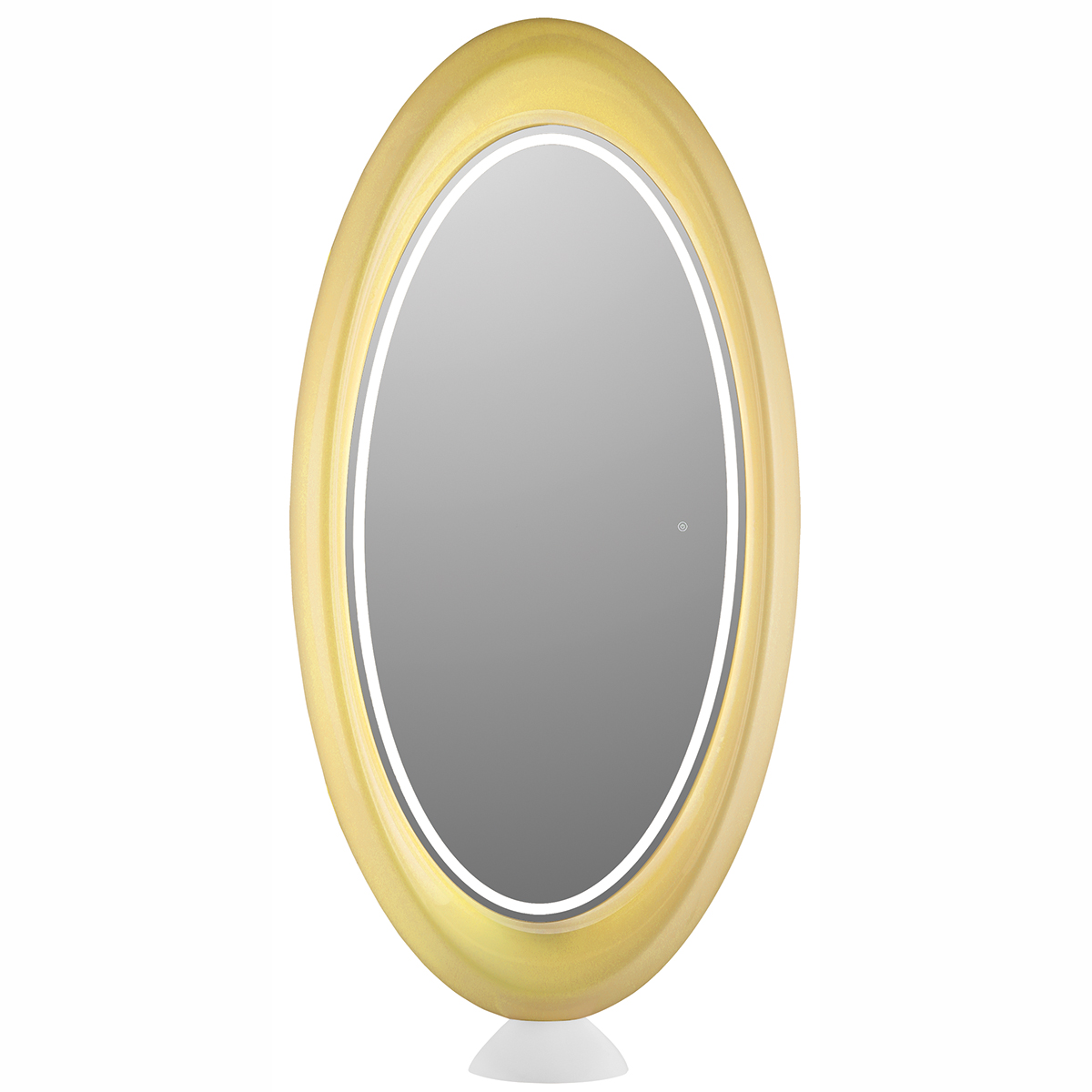 Зеркало парикмахерское двустороннее овальной формы. Зеркало оснащено светодиодной RGB LED подсветкой. Каркас выполнен из глянцевого пластика белого цвета. Крепление к полу.