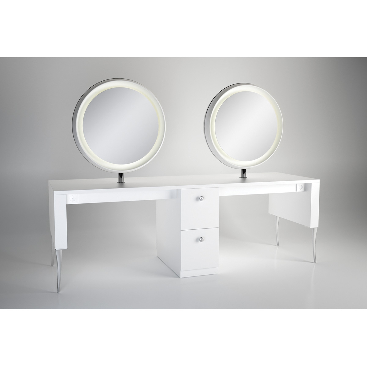 Рабочий туалет на четыре рабочих места. Рабочий туалет оснащен зеркалами округлой формы и столом на алюминиевых ножках. Рабочий стол оснащен розетками и четырьмя выдвижными ящиками.