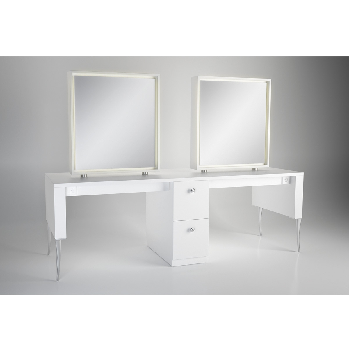 Рабочий туалет на четыре рабочих места. Рабочий туалет оснащен зеркалами прямоугольной формы и столом на алюминиевых ножках. Рабочий стол оснащен розетками и четырьмя выдвижными ящиками.