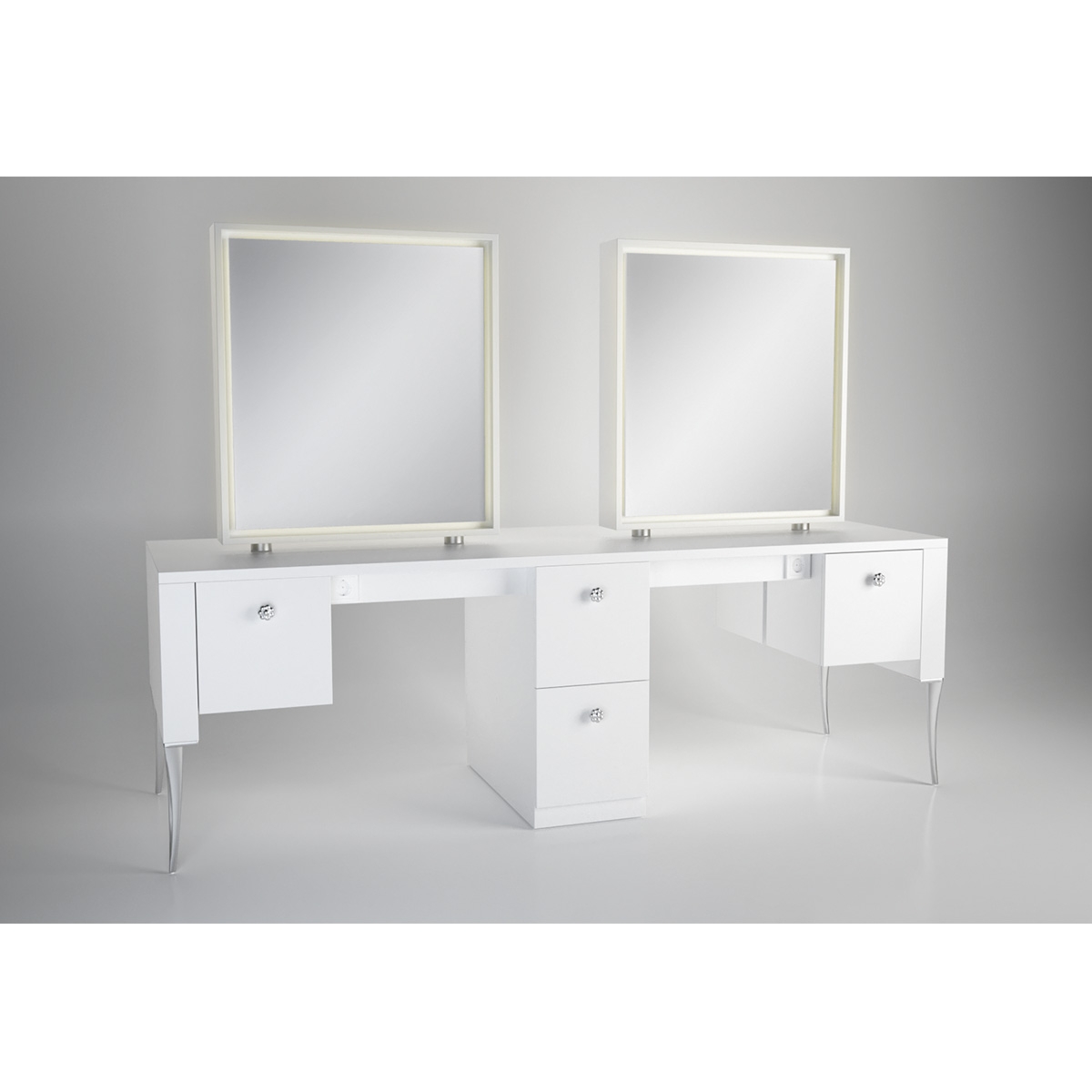 Рабочий туалет на четыре рабочих места. Рабочий туалет оснащен зеркалами прямоугольной формы и столом на алюминиевых ножках. Рабочий стол оснащен розетками и восьмью выдвижными ящиками.