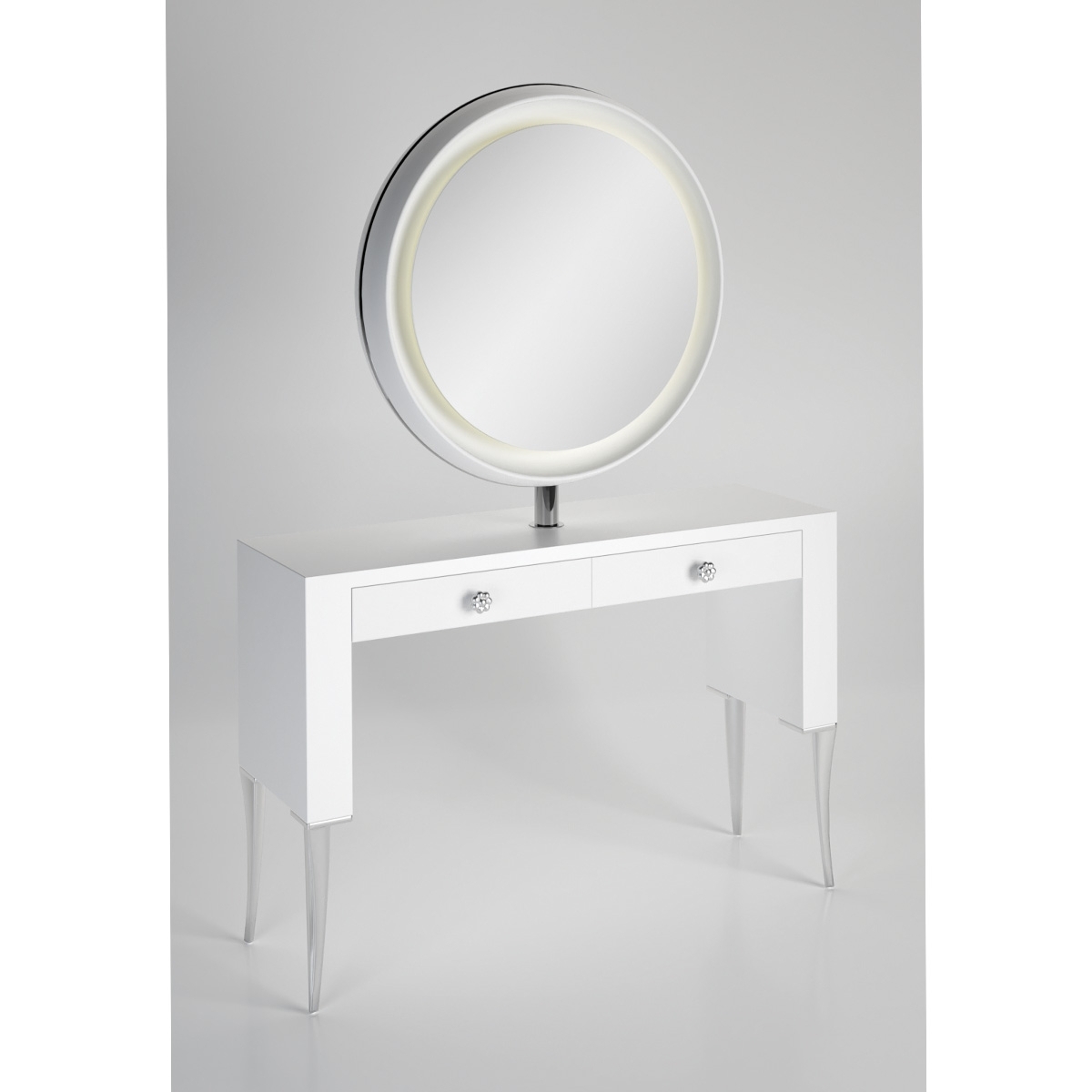 Рабочий туалет на одно рабочее место. Рабочий туалет оснащен зеркалом округлой формы и столом на алюминиевых ножках с двумя выдвижными ящиками.