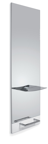 Зеркало парикмахерское. Нижняя часть зеркала выполненна из акрила или ламината. Зеркало оснащено алюминиевой столешницей оригинальной формы и подставкой под ноги. Крепление к стене.