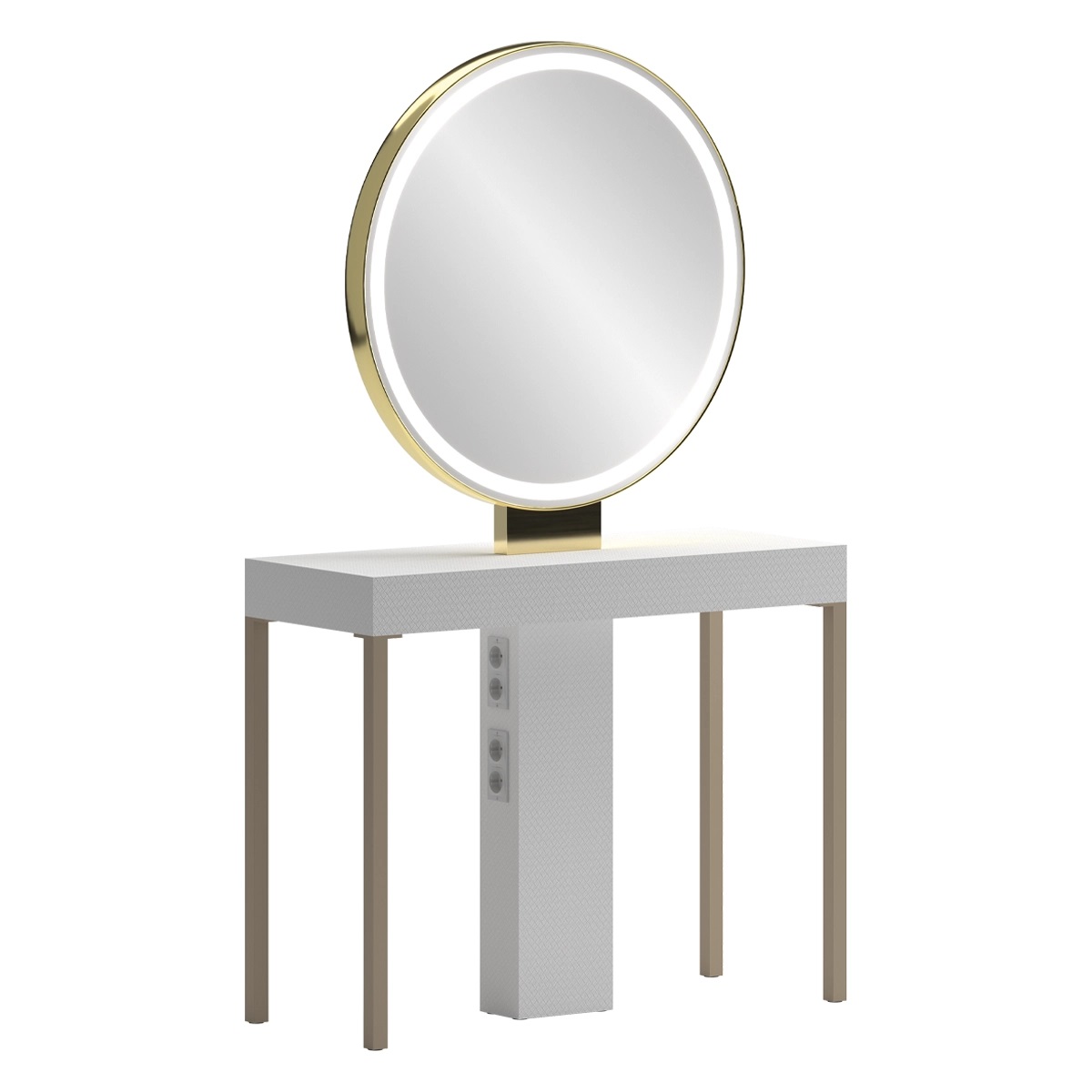 Рабочий туалет на два рабочих места. Рабочий туалет оснащен зеркалами округлой формы, рабочим столиком, а также интегрированными розетками. Рабочий стол выполнен в ламинате белого цвета QL. Окантовка рамки зеркал выполнены в глянцевом золотом, хромированном или черном цвете. Зеркала оснащены лицевой светодиодной подсветкой. Ножки рабочего стола выполнены в цвете грязи QL MUD или черный матовый.