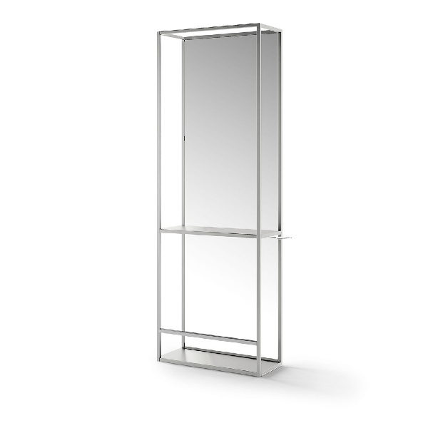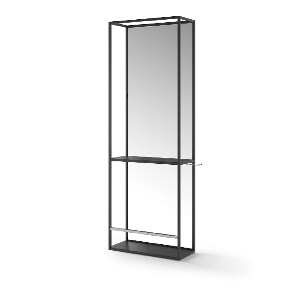 Зеркало парикмахерское с металлическим каркасом. Каркас и столешница зеркала окрашены в черный матовый цвет. Зеркало оснащено металлической столешницей и подставкой для ног. Не требует крепление к стене.