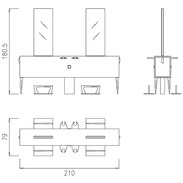 Двусторонний рабочий туалет на четыре рабочих места. Корпус рабочего туалета выполнена из дерева, ламината или акрила, по выбору клиента. Рабочий туалет оснащен фенодержателями и металлическими ножками.