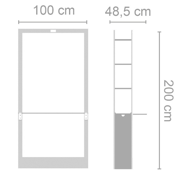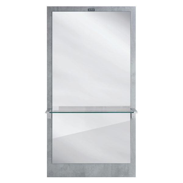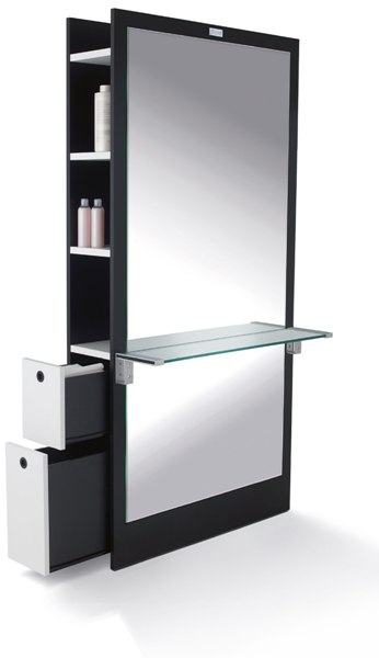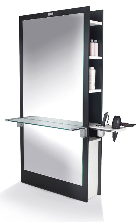 Зеркало парикмахерское одностороннее. Зеркало оснащено выдвижными ящиками, открытыми секциями, стеклянной столешницей и имеет выдвижной держатель для фена и горячих инструментов. Каркас выполнен в ламинате. Крепление к стене.