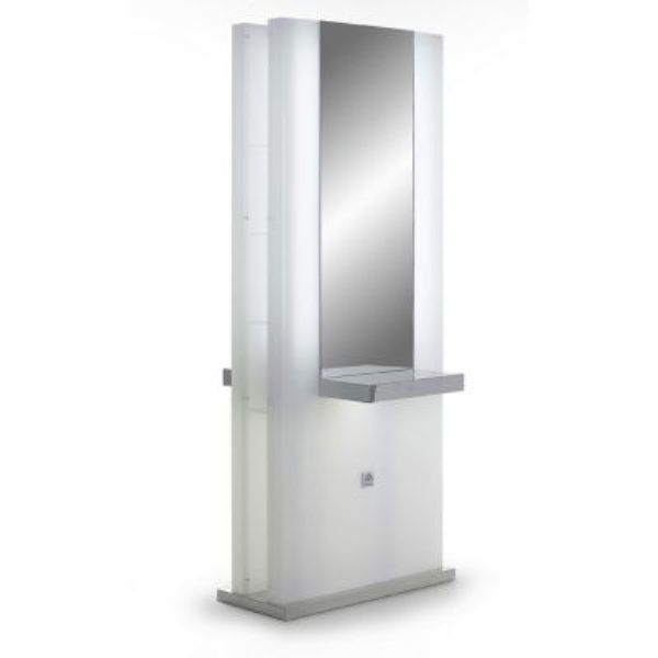 Двусторонний рабочий туалет на два рабочих места. Рама рабочего туалета выполнена из пластика белого цвета. Рабочий туалет оснащен подсветкой и металлическими хромированными столешницами. Крепление к полу.