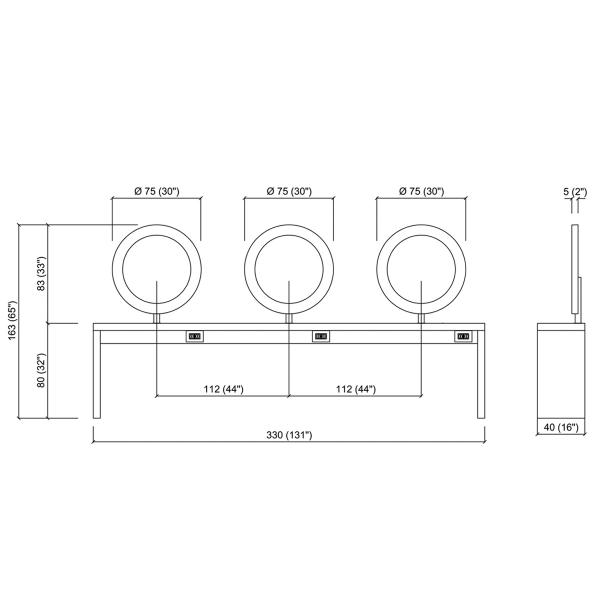 Рабочий туалет на три рабочих места. Рабочий туалет выполнен в ламинате белого цвета. Рабочий туалет оснащен зеркалами округлой формы в декоративной раме. Крепление к стене.
