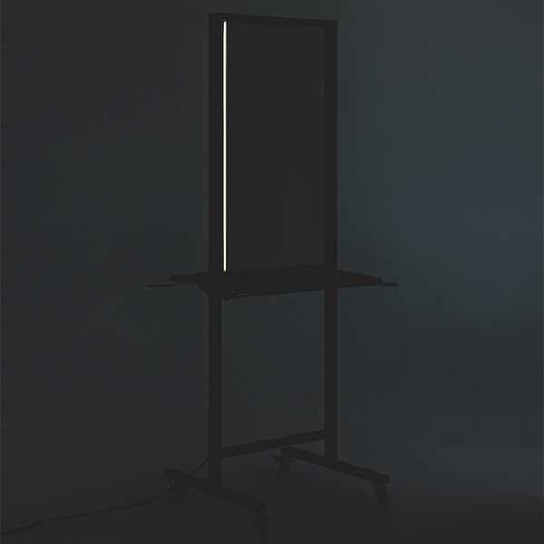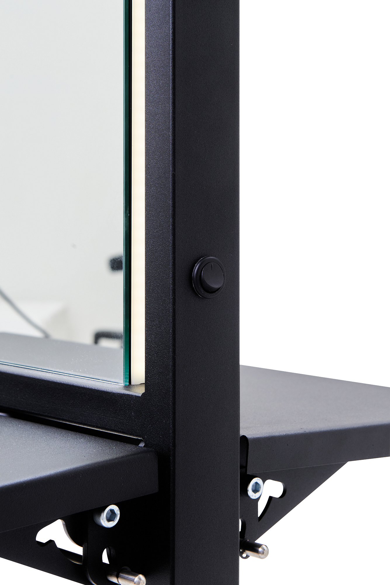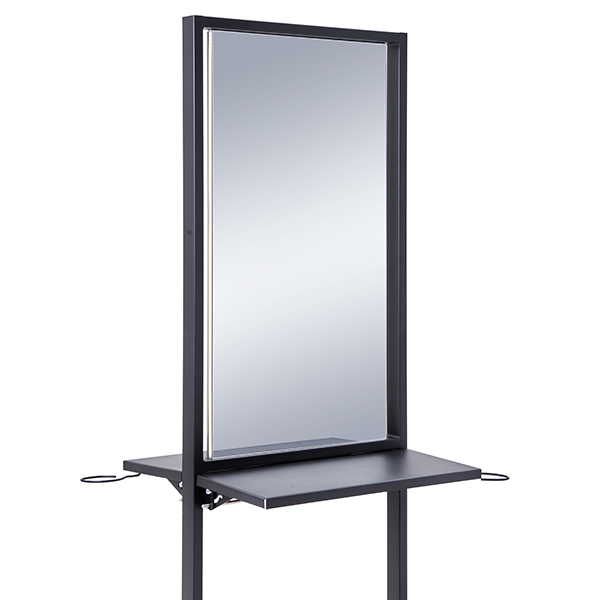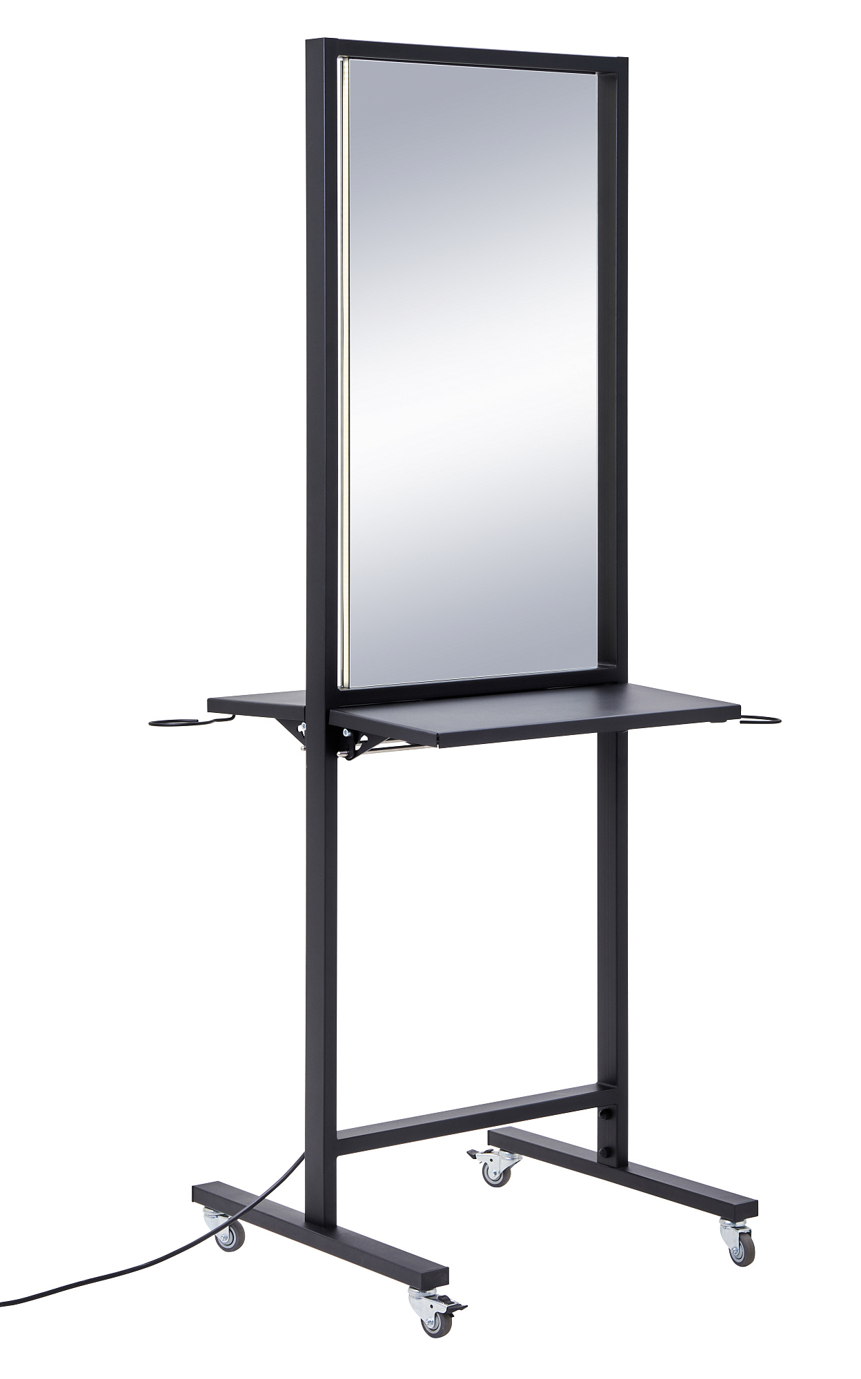 Рабочий туалет оснащен складными столешницами с интегрированными фенодержателями и блоком на 4 розетки для подключения инструментов. Благодаря складным столешницам зеркало Твист занимает минимальное пространство. Рабочий туалет легко и удобно перемещать за боковую раму каркаса.
