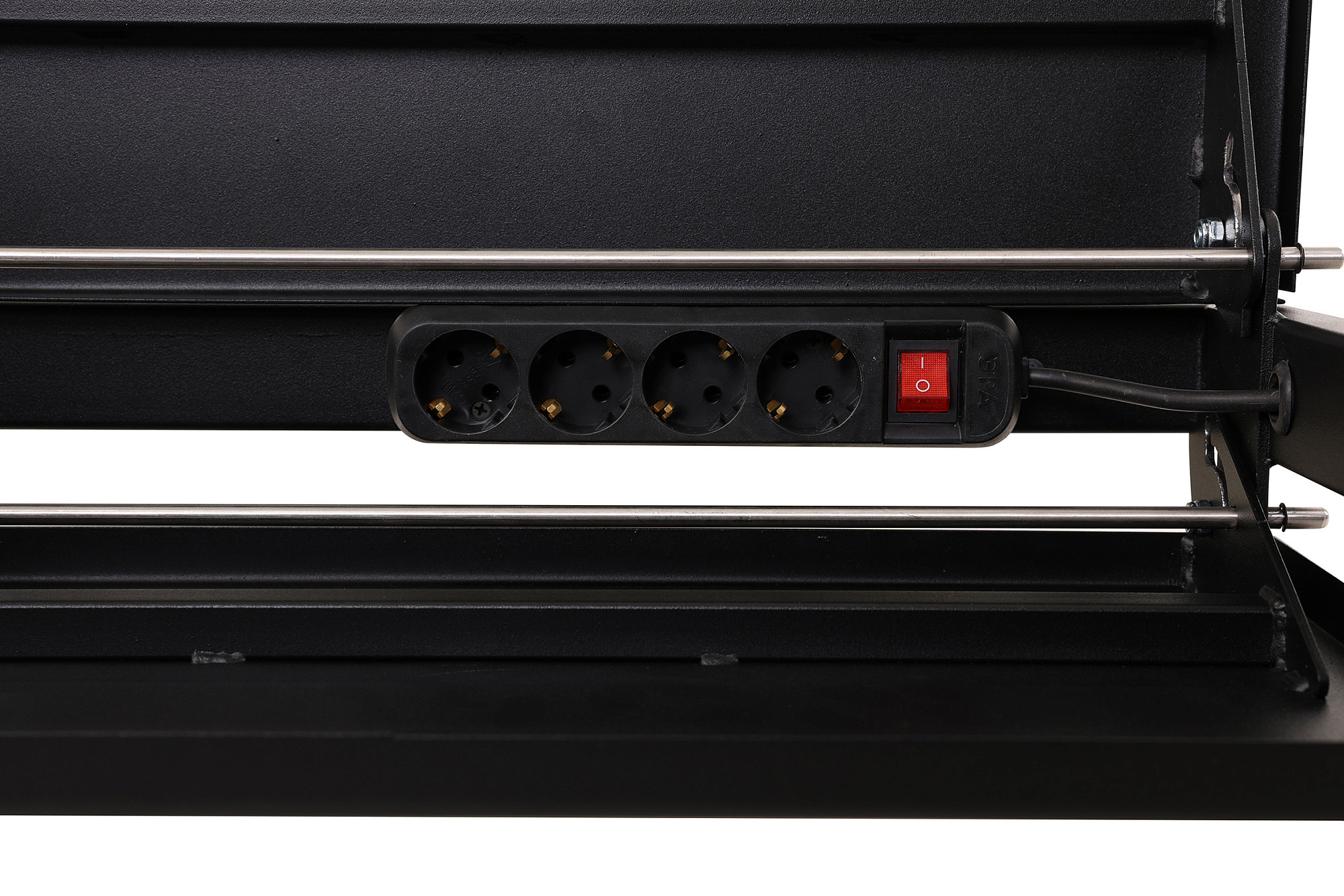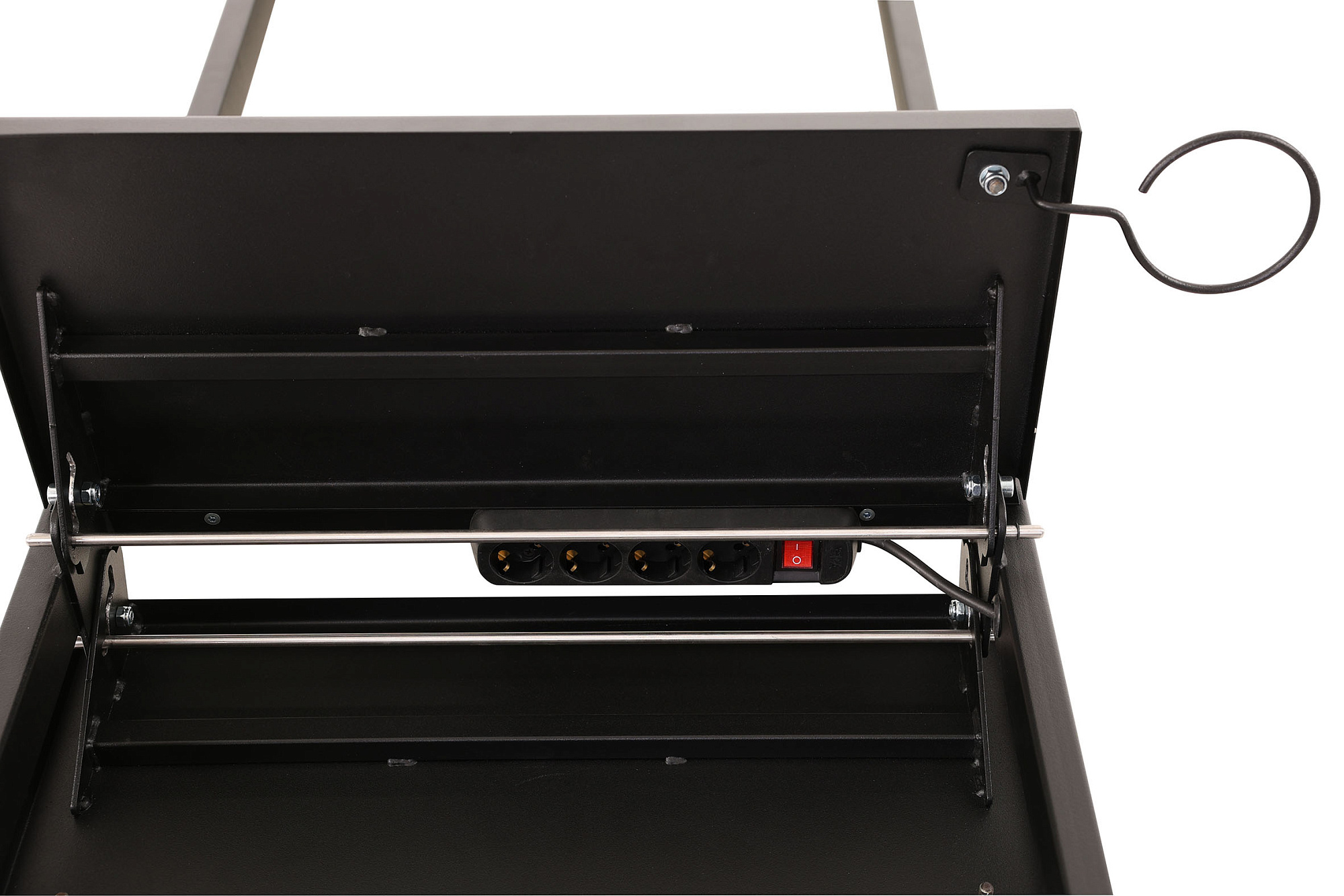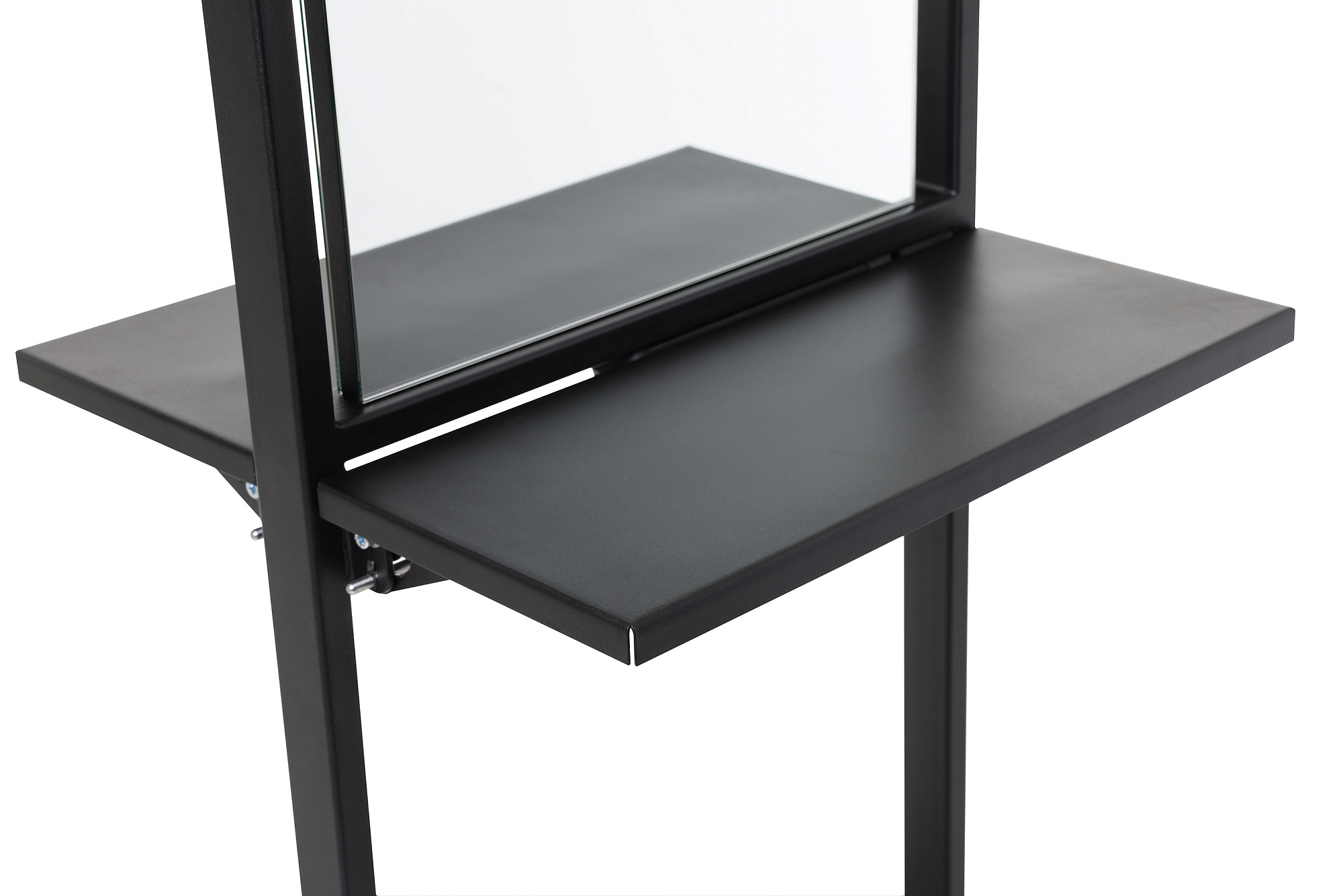 Рабочий туалет оснащен складными столешницами с интегрированными фенодержателями и блоком на 4 розетки для подключения инструментов. Благодаря складным столешницам зеркало Твист занимает минимальное пространство. Рабочий туалет легко и удобно перемещать за боковую раму каркаса.