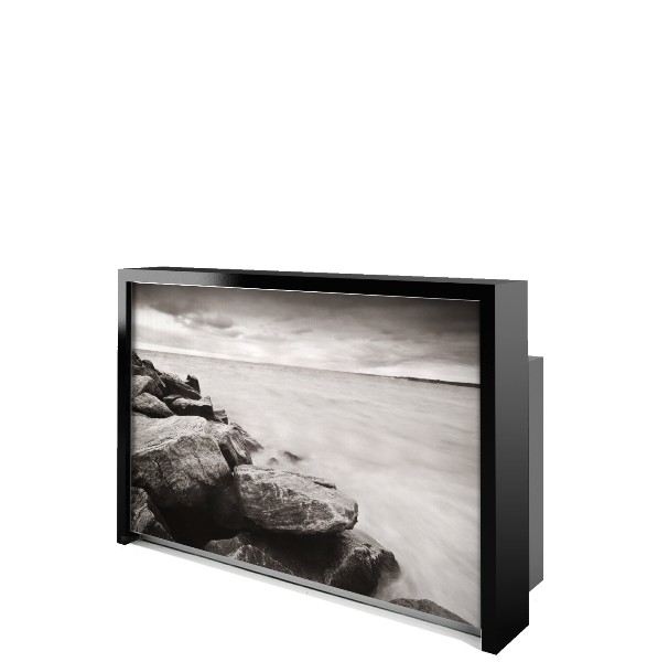 Стойка администратора, фасад выполнен из оргстекла с подсветкой и выбранным клиентом изображением, с рамой в черном глянцевом ламинате. Корпус и наполнение выполнены в ламинате белого цвета.