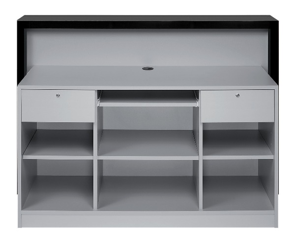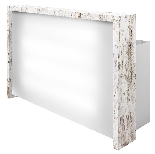 Стойка администратора, фасад выполнен из белого оргстекла с подсветкой и рамы в черном глянцевом ламинате. Корпус и наполнение выполнены в ламинате белого цвета.