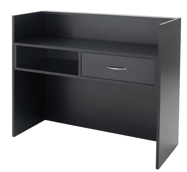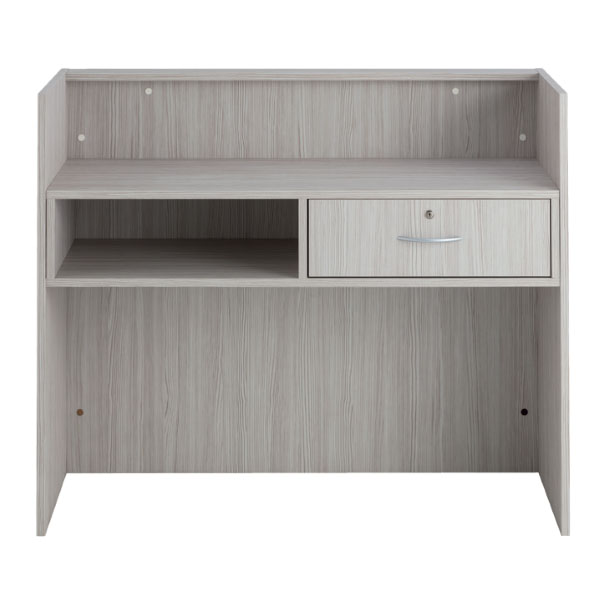 Стойка администратора оснащена выдвижным ящиком и нишей для хранения. Корпус и наполнение выполнены в ламинате.
