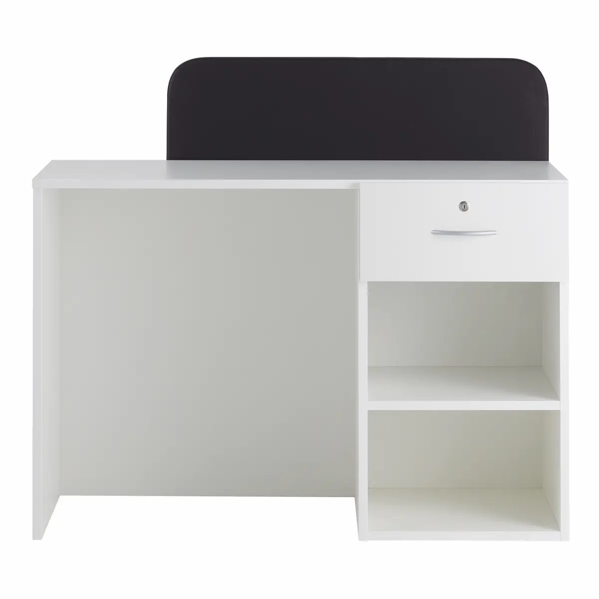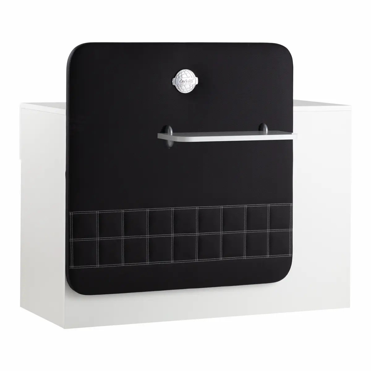 Стойка администратора оснащена выдвижным ящиком и нишами для хранения. Корпус и наполнение выполнены в ламинате, фасад выполнен из исскуственной кожи.