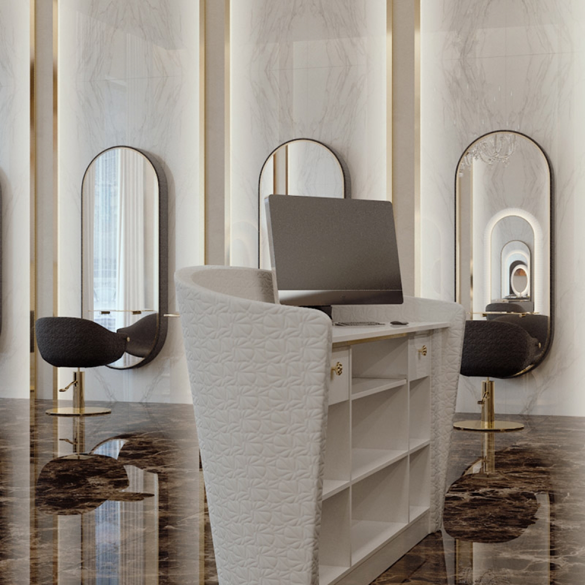 Современная и элегантная стойка администратора с декоративной отделкой фасада из искусственой кожи LOTUS SKAI (Белый WHITE, черный BLACK или розовый PINK). Корпус и наполнение выполнены в ламинате белого цвета. Стойка адмистратора оснащена выдвижными ящиками и полками для хранения. Обивка - искусственная кожа высшего качества.