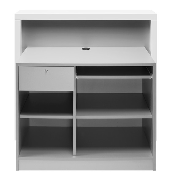 Стойка администратора, фасад выполнен из оргстекла с подсветкой и выбранным клиентом изображением, с рамой из глянцевого ламината белого или черного цвета. Корпус и наполнение выполнены в ламинате серого цвета.