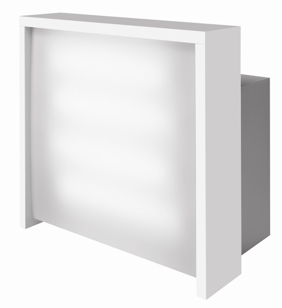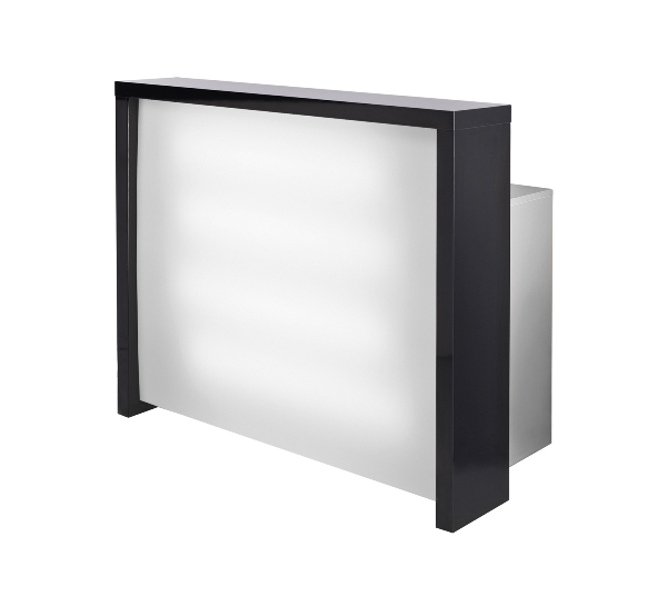 Стойка администратора, фасад выполнен из белого оргстекла с подсветкой и рамы из глянцевого ламината белого или черного цвета. Корпус и наполнение выполнены в ламинате серого цвета.