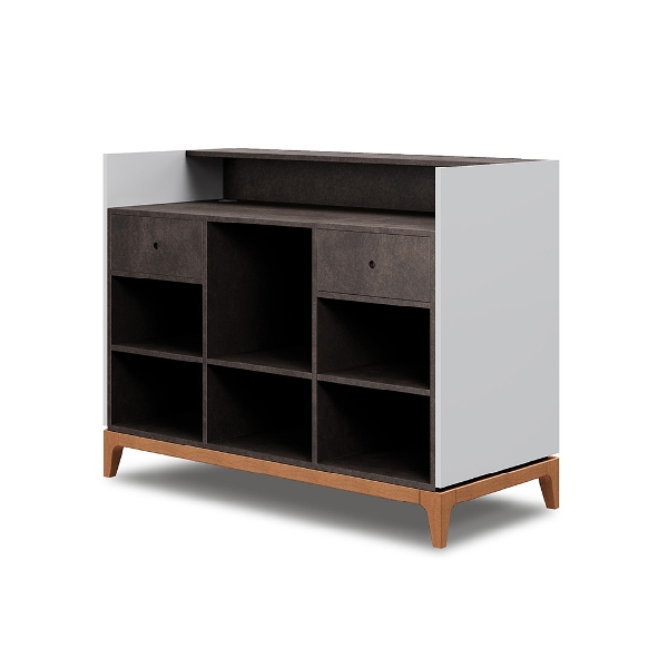 Стойка администратора оригинальной формы. Корпус и наполнение могут быть выполнены в любом цвете ламината (кроме глянцевого белого и глянцевого черного). Фасад выполнен из ламината и доступен во всех цветах.