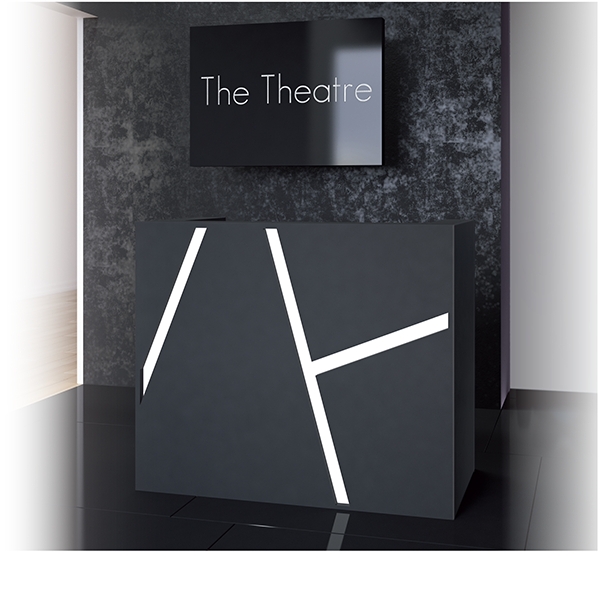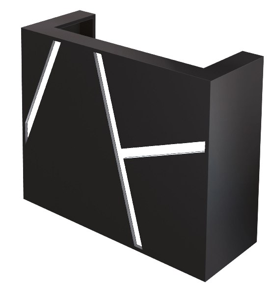 Стойка администратора оснащена подсветкой, выдвижным ящиком и нишей для хранения. Корпус и наполнение выполнены в ламинате.