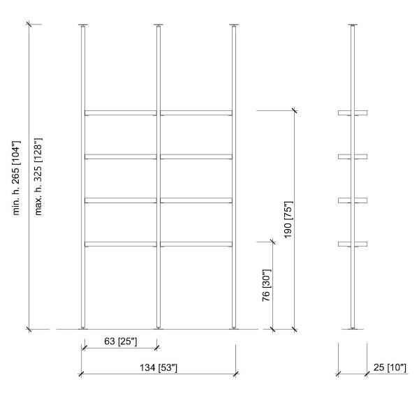 Витрина от пола до потолка. Стойки, покрытые лаком грязевого цвета QL или матово-черного. Витрина оснащена восьмью полочками. Полки выполнены из глянцево-белого или глянцево-черного акрилового ламината.