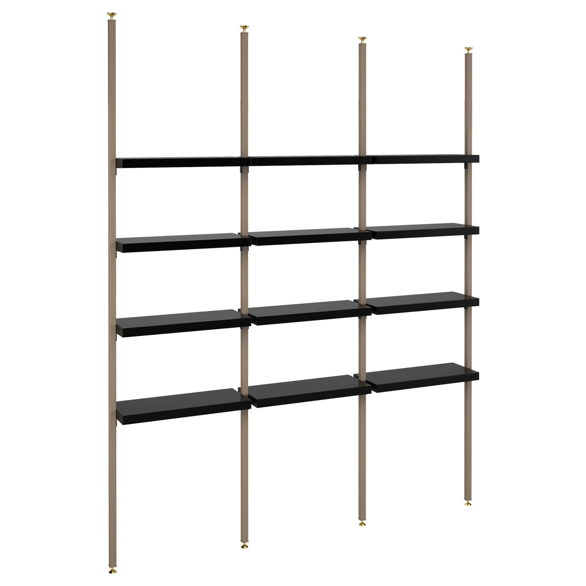 Витрина от пола до потолка. Стойки, покрытые лаком грязевого цвета QL или матово-черного. Витрина оснащена двенадцатью полочками. Полки выполнены из глянцево-белого или глянцево-черного акрилового ламината.