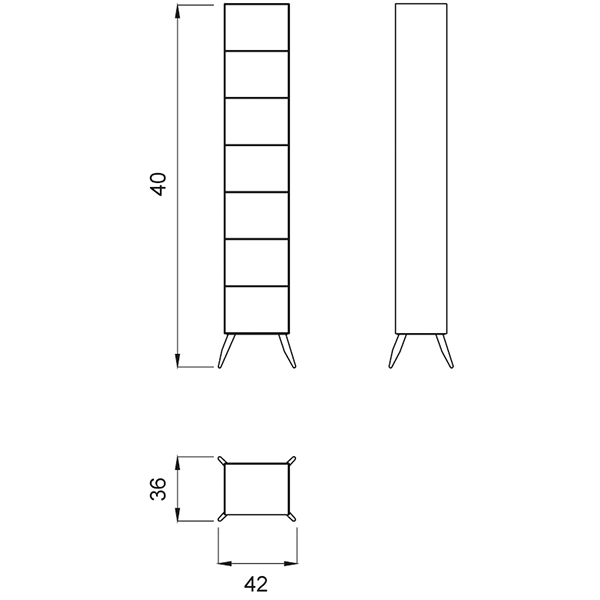 Напольная витрина с шестью полками. Витрина выполнена из акрила белого цвета. Витрина оснащена алюминиевыми ножками.