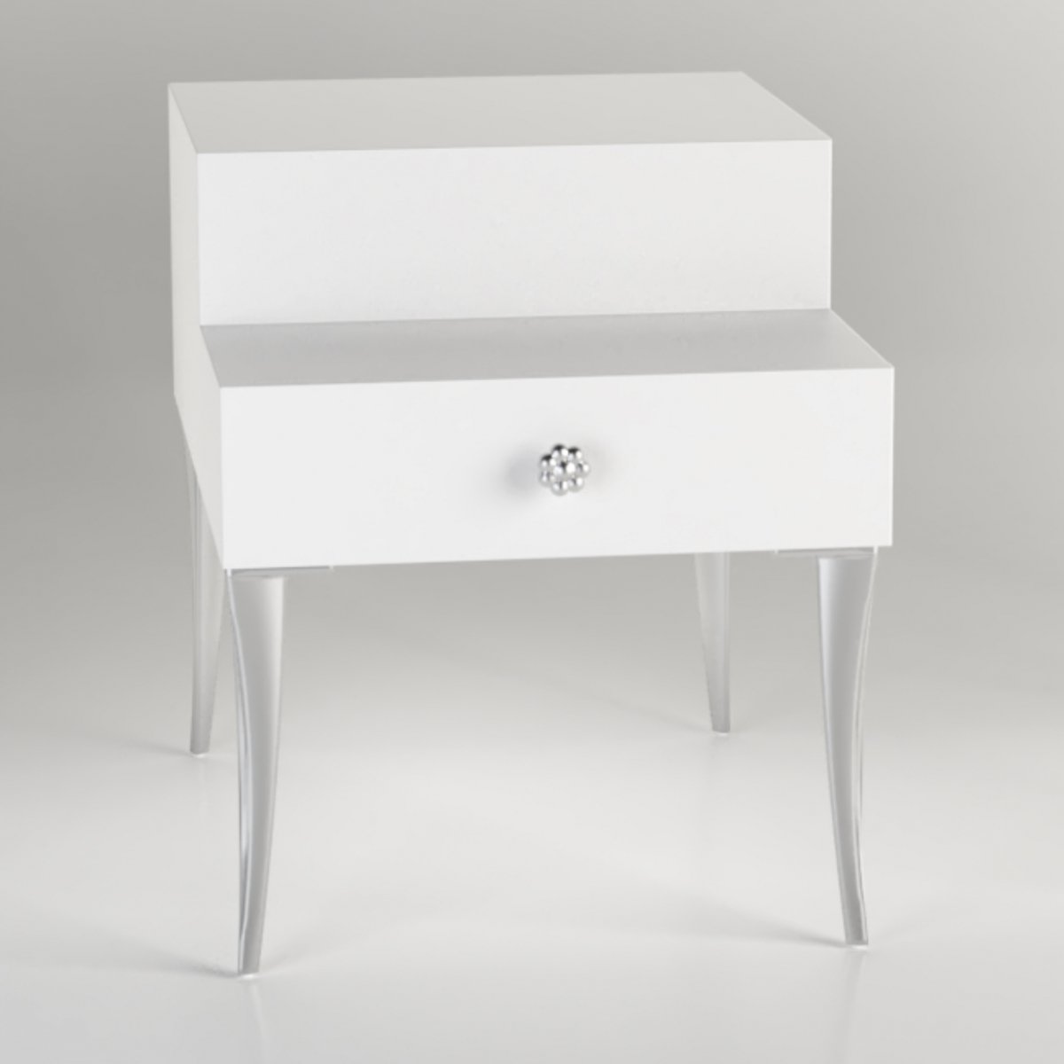 Напольная витрина с выдвижным ящиком. Витрина может быть выполнена из ламината или акрила. Витрина оснащена алюминиевыми ножками.