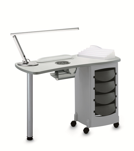 Маникюрный стол с одной тумбой, столешница из дерева, тумба из пластика. Кромка столешницы серого цвета. Опорная нога серая глянцевая. Тумба маникюрного стола оснащена четырьмя выдвижными ящиками и колесами для удобства перемещения. В комплекте: валик маникюрный, подставка под лаки, вытяжка AR3 30W.