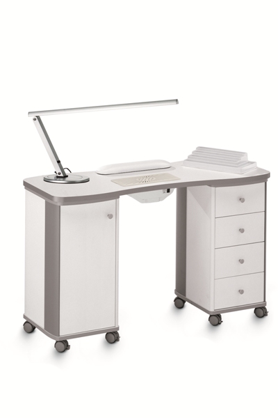 Маникюрный стол с двумя тумбами, столешница и тумбы из дерева. Тумбы маникюрного стола имеют серые вставки, кромка столешницы серого цвета. Одна тумба маникюрного стола оснащена четырьмя выдвижными ящиками, другая тумба оснащена распашной дверцей и полками. Тумбы маникюрного стола имеют колеса со стопорами для удобства перемещения. В комплекте: валик маникюрный, подставка под лаки, вытяжка AR1 20W.