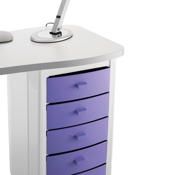 Маникюрный стол с одной тумбой, столешница из дерева, тумба из пластика. Кромка столешницы серого цвета. Опорная нога серая глянцевая. Тумба маникюрного стола оснащена пятью выдвижными ящиками и колесами со стопорами для удобства перемещения. В комплекте: валик маникюрный, подставка под лаки, вытяжка AR1 20W.
