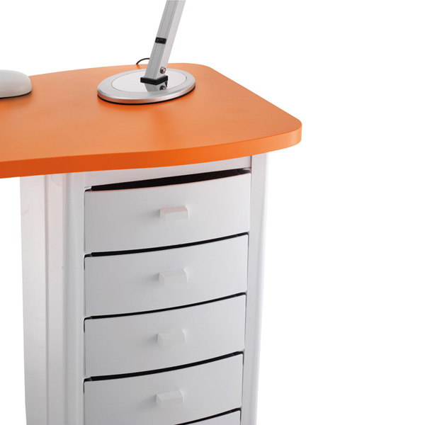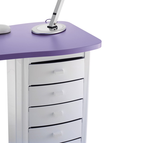 Маникюрный стол с двумя тумбами, столешница из дерева, тумбы из пластика. Кромка столешницы серого цвета. Тумбы маникюрного стола оснащены пятью выдвижными ящиками и колесами со стопорами для удобства перемещения. В комплекте: валик маникюрный, подставка под лаки.