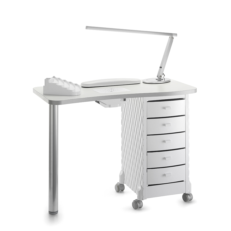 Маникюрный стол с одной тумбой, столешница ламинированная, тумба из прочного пластика с декоративной стеганой отделкой боковин. Тумба маникюрного стола оснащена пятью выдвижными ящиками и колесами со стопорами для удобства перемещения. В комплекте: валик маникюрный, подставка под лаки, вытяжка AR1 20W.