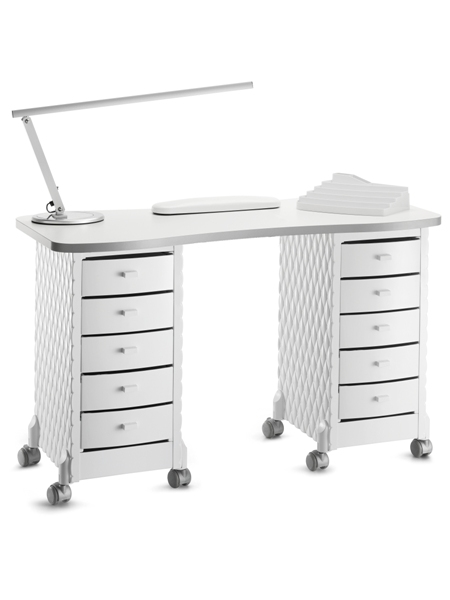 Маникюрный стол с двумя тумбами, столешница ламинированная, тумбы из прочного пластика с декоративной стеганой отделкой боковин. Тумбы маникюрного стола оснащены пятью выдвижными ящиками и колесами со стопорами для удобства перемещения. В комплекте: валик маникюрный, подставка под лаки.