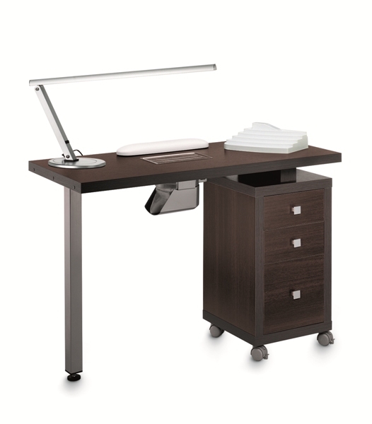 Маникюрный стол с одной тумбой, столешница и тумба из дерева. Тумба маникюрного стола оснащена тремя выдвижными ящиками и колесами со стопорами для удобства перемещения. В комплекте: валик маникюрный, подставка под лаки, вытяжка: AR2 30W.