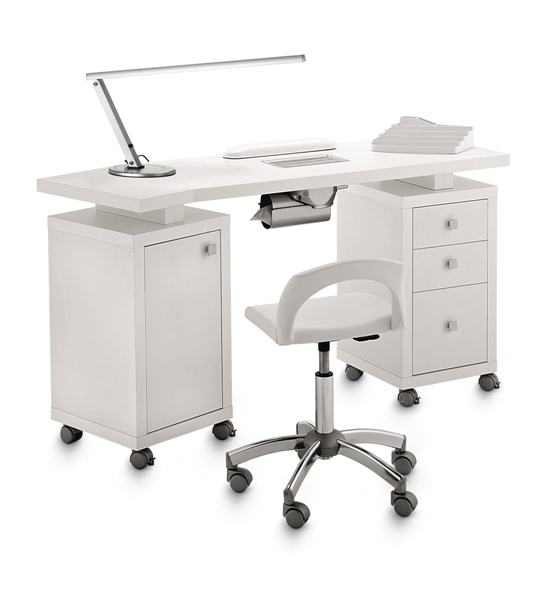 Маникюрный стол с двумя тумбами, столешница и тумбы из дерева. Одна тумба маникюрного стола оснащена тремя выдвижными ящиками, другая тумба оснащена распашной дверцей и полкой. Тумбы маникюрного стола имеют колеса со стопорами для удобства перемещения. В комплекте: валик маникюрный, подставка под лаки, вытяжка AR2 30W.