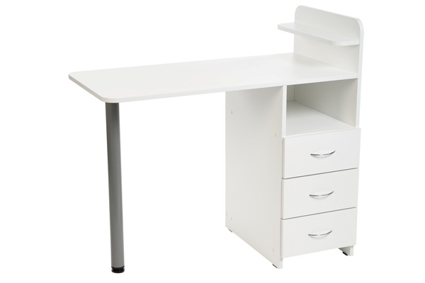 Классический и функциональный маникюрный стол с подставками под лаки. Комплектуется тумбой с тремя удобными ящиками и открытой полкой, что позволит мастеру без труда убирать необходимые инструменты.