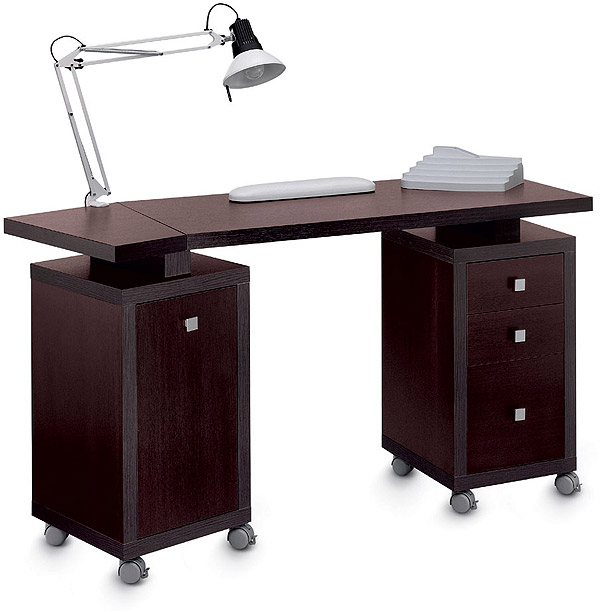 Маникюрный стол с двумя тумбами, столешница и тумбы из дерева. Одна тумба маникюрного стола оснащена тремя выдвижными ящиками, другая тумба оснащена распашной дверцей и полкой. Тумбы маникюрного стола имеют колеса со стопорами для удобства перемещения. В комплекте: валик маникюрный, подставка под лаки.