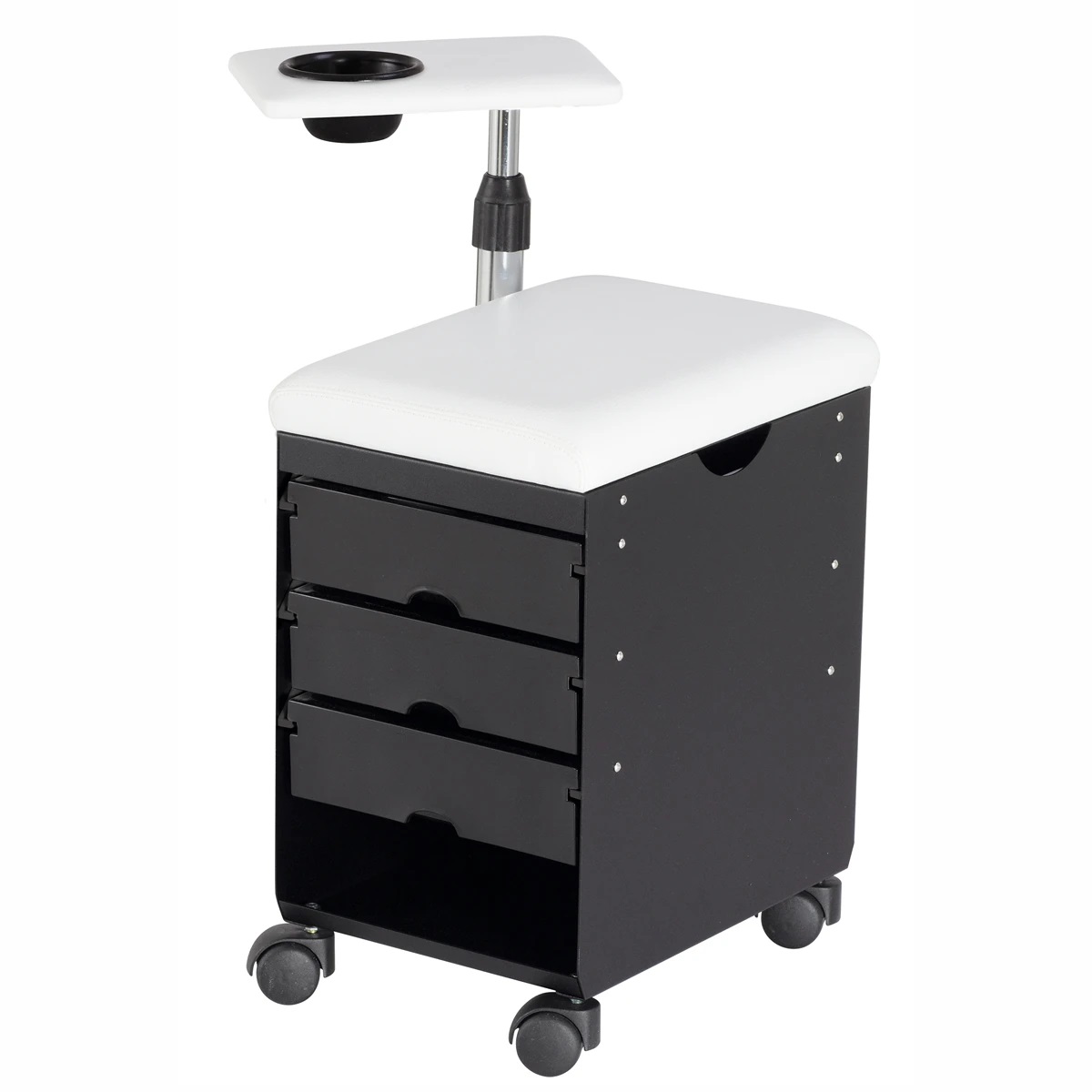 Стойка маникюрная на колесиках. Стойка маникюрная оснащена тремя выдвижными ящиками закрытого типа и специальной полочкой, которая регулируется по высоте. Каркас стойки выполнен из металла, мягкий элемент сиденья и рабочей полочки выполнен из искусственной кожи высшего качества.