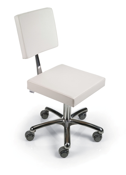 Низкий стул для мастера. Стул оснащен алюминиевым основанием в форме пятилучья с колесами. Рекомендован в кабинет педикюра. Обивка - искусственная кожа высшего качества.