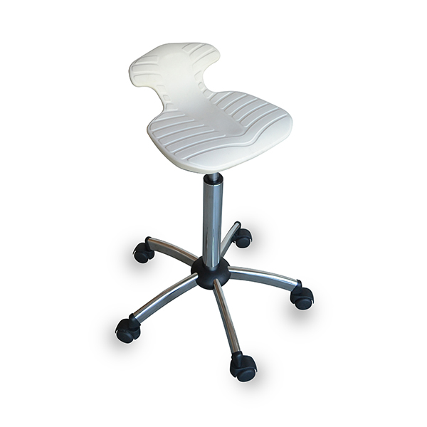 Высокий стул мастера. Стул оснащен алюминиевым основанием в форме пятилучья, колесами и газлифтом для регулировки высоты.