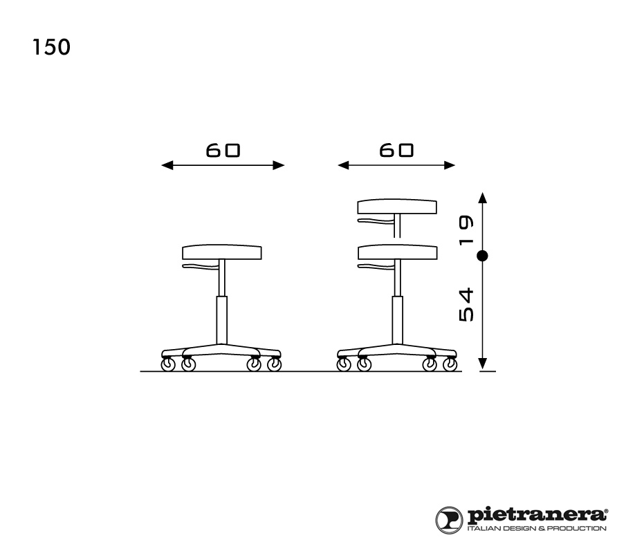 Cтул мастера 150 оснащен пятилучьем на колесах и газлифтом для регулировки высоты. Посадочное место – круглое.